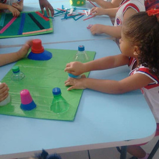 Atividade para desenvolver a coordenação motora utilizando a reciclagem de materiais.Turminha do Grupo 3, professora Mariane Goveia auxiliada por Aline Ribeiro e Laina